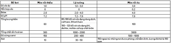 Bảng tiêu chuẩn hóa chất trong bể bơi
