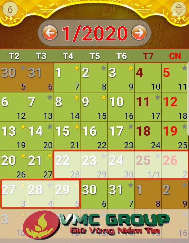 Từ thứ 4 ngày 22/1/2020 đến hết thứ 4 ngày 29/1/2020 (tức từ ngày 28 tháng Chạp năm Kỷ Hợi đến hết mùng 5 tháng Giêng năm Canh Tý)