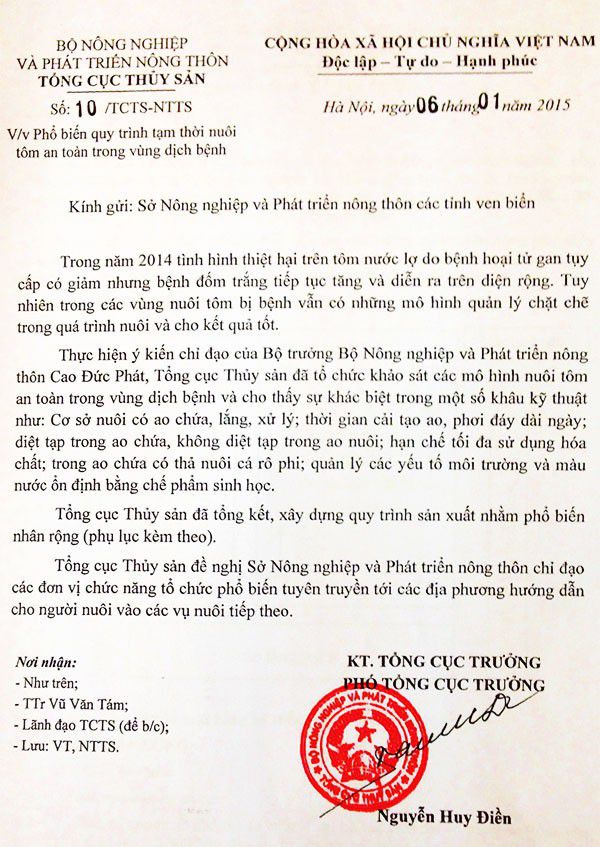 Trên cơ sở kết quả khảo sát các mô hình nuôi tôm an toàn trong vùng dịch bệnh trong thời gian qua, Tổng cục Thủy sản đã tổng kết đánh giá và xây dựng quy trình sản xuất an toàn trong vùng dịch bệnh để phổ biến nhân rộng. Ngày 6/1/2015, Tổng cục Thủy sản đã có Công văn số10/TCTS-NTTS đề nghị các Sở Nông nghiệp và PTNT chỉ đạo các đơn vị chức năng phổ biến, tuyên truyền hướng dẫn quy trình nuôi tôm nước lợ an toàn trong vùng dịch bệnh để người nuôi thực hiện trong các vụ nuôi tiếp theo.